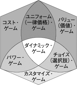 六角形の中の7つのプライシング・ゲームの配置は、価格設定の3つの情報源(コスト、競合、価値)、4つの経済的視点(価格弾力性、価格区分、ゲーム理論、需要と供給)、市場特性の間の相互作用を踏まえて位置づけている。